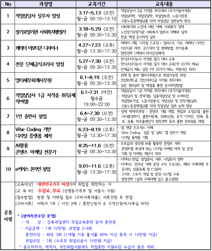 ※ 자세한 접수기간 및 교육내용은 교육프로그램에서 확인해주세요 -> 전체프로그램 | 강북여성인력개발센터 (바로가기 클릭)