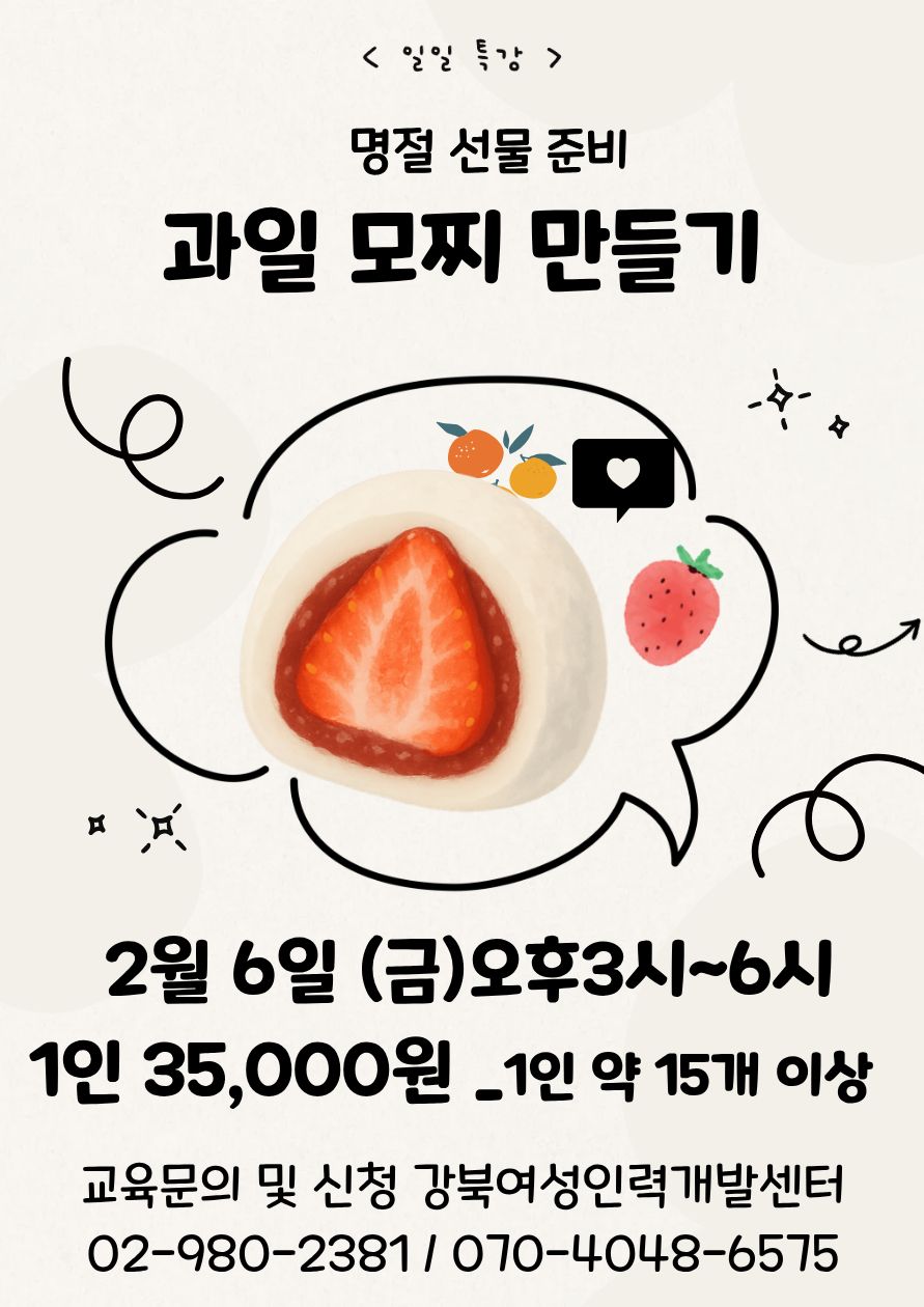 다중 게시판 교육 채용정보 센터소식 전체 프로그램 ★개강★도전! 웹소설 쓰기(입문) ★대기★내일배움(주간)_산모 신생아 건강관리사(신규자) ★개강★내일배움(주간)_전자책편집디자인(인디자인활용) ★대기★내일배움(주간)_아이돌봄 인력양성(표준교육) 알기 쉬운 토지경매_귀농,귀촌,주말농장 (오후) 내일배움카드 ★대기★내일배움(주간)_산모 신생아 건강관리사(신규자) ★개강★내일배움(주간)_전자책편집디자인(인디자인활용) ★대기★내일배움(주간)_아이돌봄 인력양성(표준교육) 내일배움(야간)_요양보호사 취득(물리치료사, 작업치료사, 간호조무사 소지 내일배움(주간)_ITQ 자격증취득(한글,엑셀) 국비지원 조회된 결과가 없습니다. 일반과정 ★개강★도전! 웹소설 쓰기(입문) 알기 쉬운 토지경매_귀농,귀촌,주말농장 (오후) (오후) 과일 찹쌀떡 만들기_원데이 (오전) 실기시험 집중케어반_떡제조기능사 실기 마음을 읽는 타로상담사 (야간) 전체 프로그램 더보기더보기 취업정보 [채용중] (상계동) 장애인복지관 조리보조원 모집 [채용중] 공동생활가정 노인요양원 조리원 모집 [채용중] 주야간복지센터 간호조무사 모집 [채용중] 서울지구병원 공무직근로자 (민간조리원) 채용 [새일여성인턴 참여 모집] 2026년 새일여성인턴 참여기업 및 참여자 모집 취업정보 더보기더보기 공지사항 (서울특별시 지정) 강북여성인력개발센터 관장 공개채용 2026년 서울시 아이돌봄 교육기관 [안내] 2025 강북구청 일자리 박람회 2025 인구주택총조사 조사요원 모집공고_강북구청 서울시 우먼업 구직지원금 3차 모집(8/19~9/4) 공지사항 더보기더보기