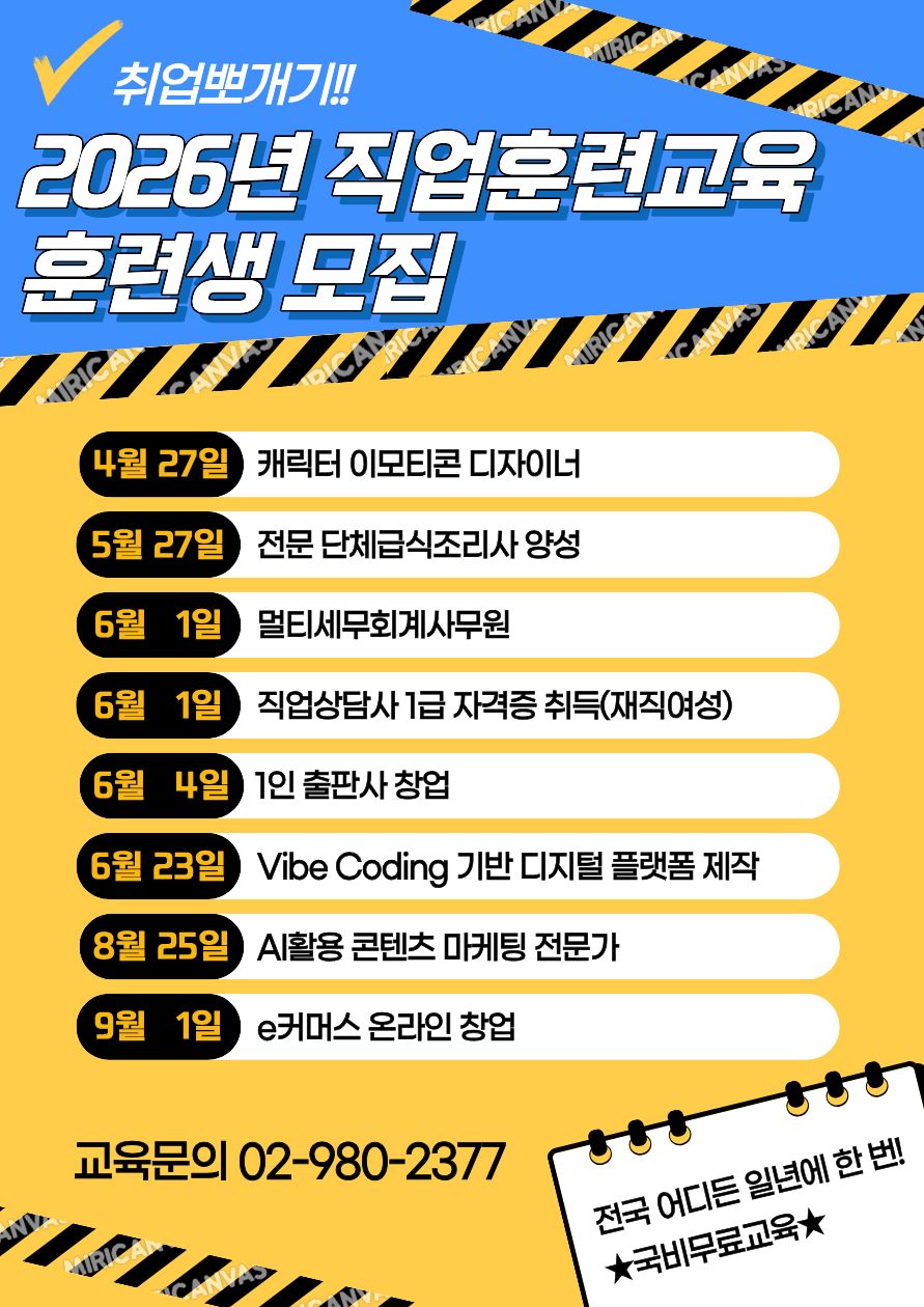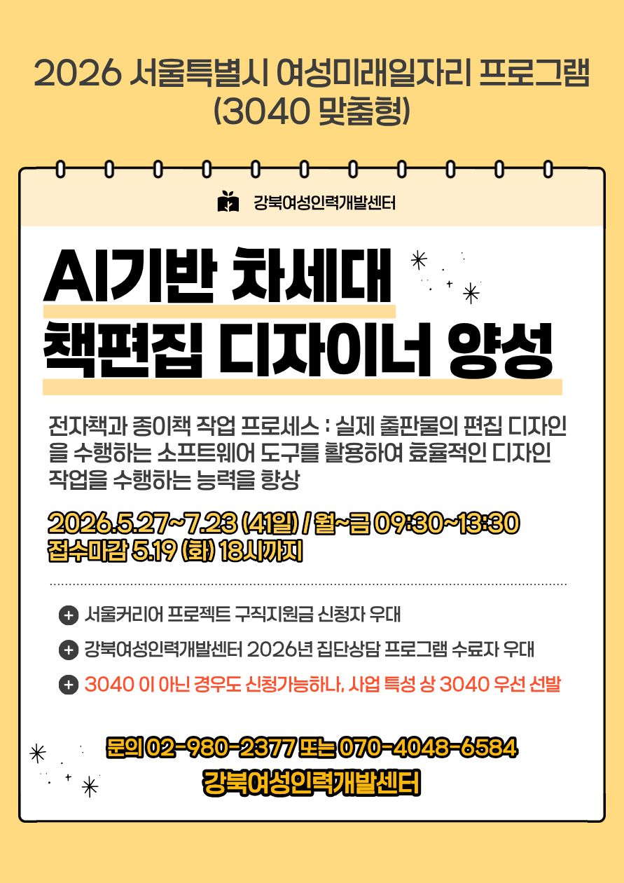 다중 게시판 교육 채용정보 센터소식 전체 프로그램 (국비무료) 집단상담프로그램 5차 ★대기★내일배움(주간)_아이돌봄 인력양성(표준교육) [국비무료] 캐릭터 이모티콘 디자이너 ★개강★기초 한글로 레벨업!(야간) 내일배움(주간)_요양보호사 취득(사회복지사 소지자) 내일배움카드 ★대기★내일배움(주간)_아이돌봄 인력양성(표준교육) 내일배움(주간)_요양보호사 취득(사회복지사 소지자) 내일배움(야간) 일식조리실무향상(일본가정식) 내일배움(야간) 맛있고 건강한 저염식(한식,양식) ★개강★내일배움(주간)_산모 신생아 건강관리사(신규자) 국비지원 (국비무료) 집단상담프로그램 5차 [국비무료] 캐릭터 이모티콘 디자이너 (국비무료) 집단상담프로그램 6차 (국비무료) 집단상담프로그램 7차 [국비무료] 전문 단체급식조리사 양성 일반과정 ★개강★기초 한글로 레벨업!(야간) 마음을 읽는 타로상담사 (야간) 알기 쉬운 토지경매_귀농,귀촌,주말농장 (오후) 실전 사례를 통해 배우는 부동산 경매 (저녁) (오전) 블루베리떡케이크 만들기 전체 프로그램 더보기더보기 취업정보 [채용중] 요양원 조리사 모집 [채용중] 소방서 119 안전센터 직원식당 조리원 구인 [채용중] 중계은행사거리점 카페 바리스타 모집 [채용마감] 교육기관 청소원 모집 [채용중] 데이케어센터 사무원 모집 취업정보 더보기더보기 공지사항 2026년 산모 신생아 건강관리사 교육계획 2026년 국비무료 직업교육훈련 모집 2026년 아이돌봄 인력양성 교육계획 (서울특별시 지정) 강북여성인력개발센터 관장 공개채용 2026년 서울시 아이돌봄 교육기관 공지사항 더보기더보기